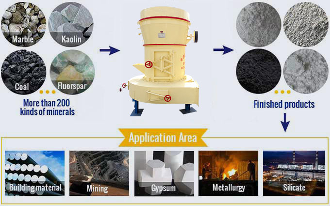 High-strength grinding mill can be used in non-flammable and explosive mines, metallurgy, chemicals, building materials and other industries. It is suitable for crushing materials such as barite, limestone, ceramics and slag with a Mohs hardness of not more than 9.3 and a humidity of 6% or less. The finished grain size is adjusted in the range of 80-425 mesh (the finest 1000 mesh). A 30-80 mesh coarse powder can be produced by adding special equipment inside the machine.