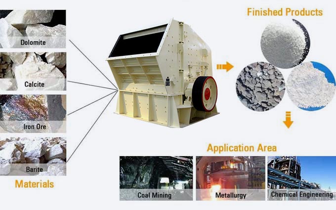 Materials that can be broken: limestone, gangue, granite, bluestone, construction waste, cobblestone, river pebble, basalt, basalt, iron ore, quartzite, calcite, quartzite, concrete. Granite, limestone, concrete, glass, cement clinker and certain metals etc.