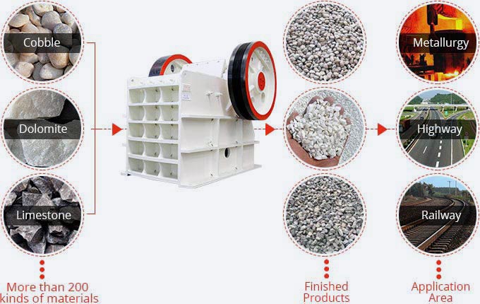 Materials that can be broken: pebbles, calcite, granite, quartzite, concrete, dolomite, bluestone, iron ore, limestone, iron ore, coal gangue, construction refuse, silica, cobblestone, basalt, sandstone, rock, ore, basalt, construction waste, Glass, cement clinker, and certain metals etc.