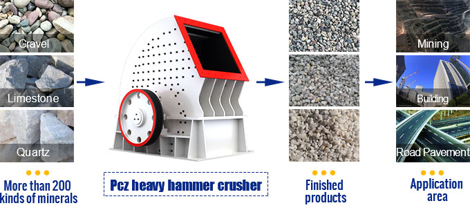 PCZ heavy hammer crusher is used for over 200 kinds of stones, such as limestone, concrete,aggregate, basalt, granite, quartz, gravel, marble, pebble, silica, coal, construction waste, etc.