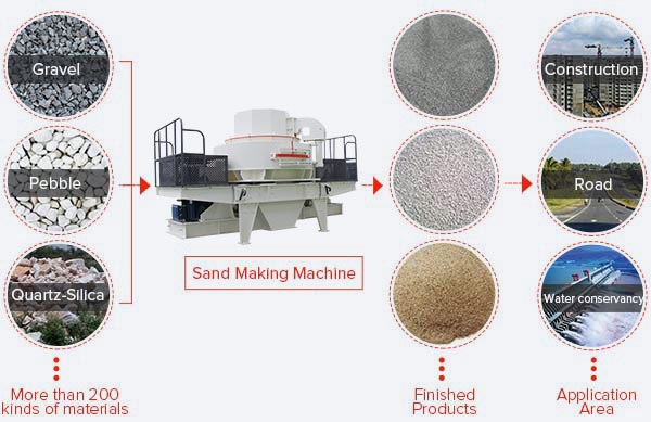 The sand making machine uses the stone-by-stone principle to achieve the crushing effect of good shape and high sand production ratio. This machine is applicable to the brittle materials, whose Mohs hardness is less than level 9, not suitable for the viscous materials or stones including too much soil.