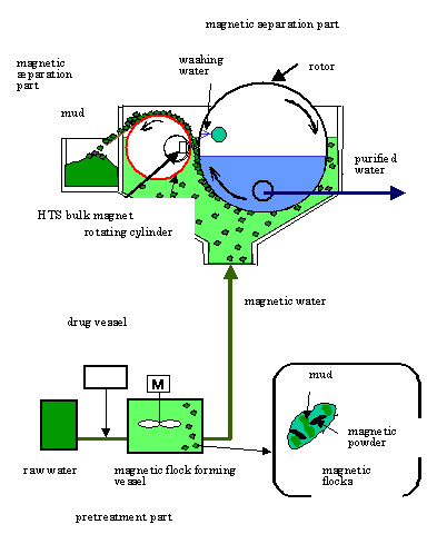 After the pulp flows into the tank through the ore feed tank, the ore particles enter the ore feed area of the tank in a loose state under the action of the jet stream. Under the action of magnetic field, the magnetic ore particles gather to form 'magnetic ball' or 'magnetic chain'. The 'magnetic ball' or 'magnetic chain' moves towards the magnetic end in the ore pulp under the action of magnetic force and is adsorbed on the cylinder. Because the magnetic ends are arranged alternately along the rotation direction of the cylinder and are fixed during operation. The 'magnetic ball' or 'magnetic chain' will produce magnetic agitation phenomenon due to the alternation of the magnetic ends when 'magnetic ball' or 'magnetic chain' rotating with the cylinder, the gangue and other non-magnetic minerals mixed in the 'magnetic ball' or 'magnetic chain' will fall off during turnover, and the 'magnetic ball' or 'magnetic chain' absorbed on the surface of the cylinder are the ore concentrate.