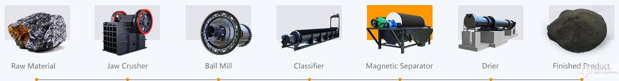 Firstly, the ore is crushed by a crusher and ground by a ball mill (150-200 mesh). After the ore particles have reached a certain fineness, and then according to the material to choose different beneficiation methods. The main ore processing equipment has a flotation machine, magnetic separator, shaking table, spiral chute, etc.