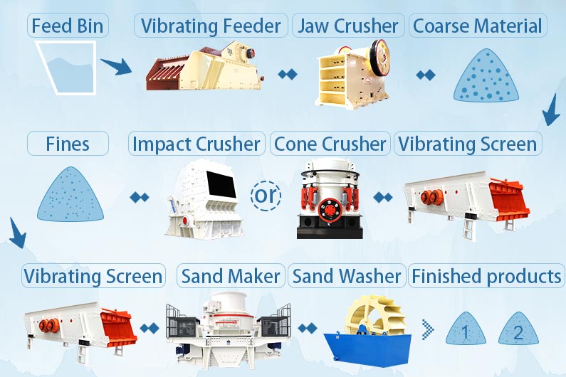 In order to show the workflow clearly, we present the picture on the production site, which shows how the machine-made sand production line works. If you want to learn about the specific configuration, you can contact us to explain your requirements, and we will provide you suitable equipment for free depending on your real needs. Of course, if you have spare time, you can visit our factory. We can take you to the equipment production workshop, inspect customer sand production site, so as you have a close understanding that how the sand production line operates.