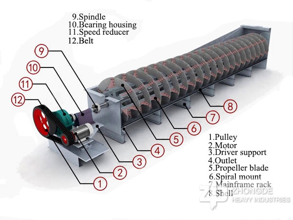 The classifier is mainly composed of a transmission device, a spiral body, a trough body, a lifting mechanism, a lower bearing (bearing bush) and a discharge valve.