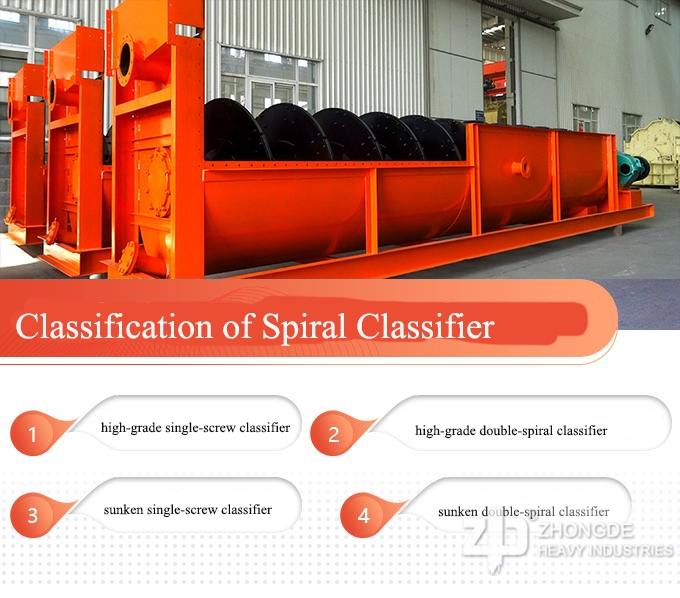 According to the structure and the single and double helix, the spiral classifier is mainly divided into a high-grade single-screw classifier, a high-grade double-spiral classifier, a sunken single-screw classifier, and a sunken double-spiral classifier. The sunken spiral classifier is mainly used for fine-grain classification, and the high-grade spiral classifier has better effect on mineral coarse grain classification.