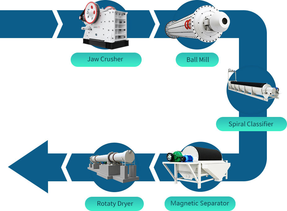 Iron ore is an important raw material for iron and steel production enterprises. Iron ore magnetic separation production line consists of Vibrating Feeder, Chute Feeder, Jaw Crusher, Vibrating Screen, Ball Mill, Classifier, Magnetic Separator, Concentrators, Dryer and other major equipment.