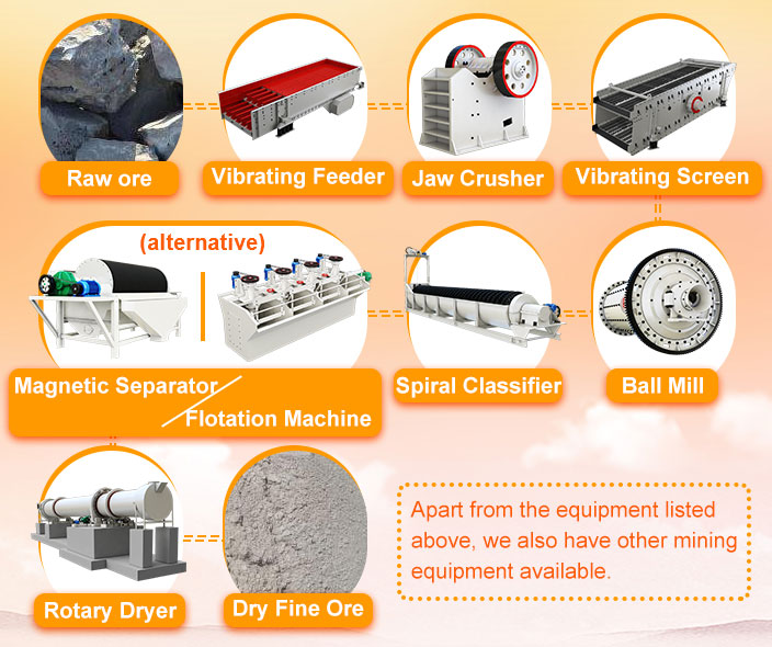 ball mill, spiral classifier, flotation machine, magnetic separator, etc.